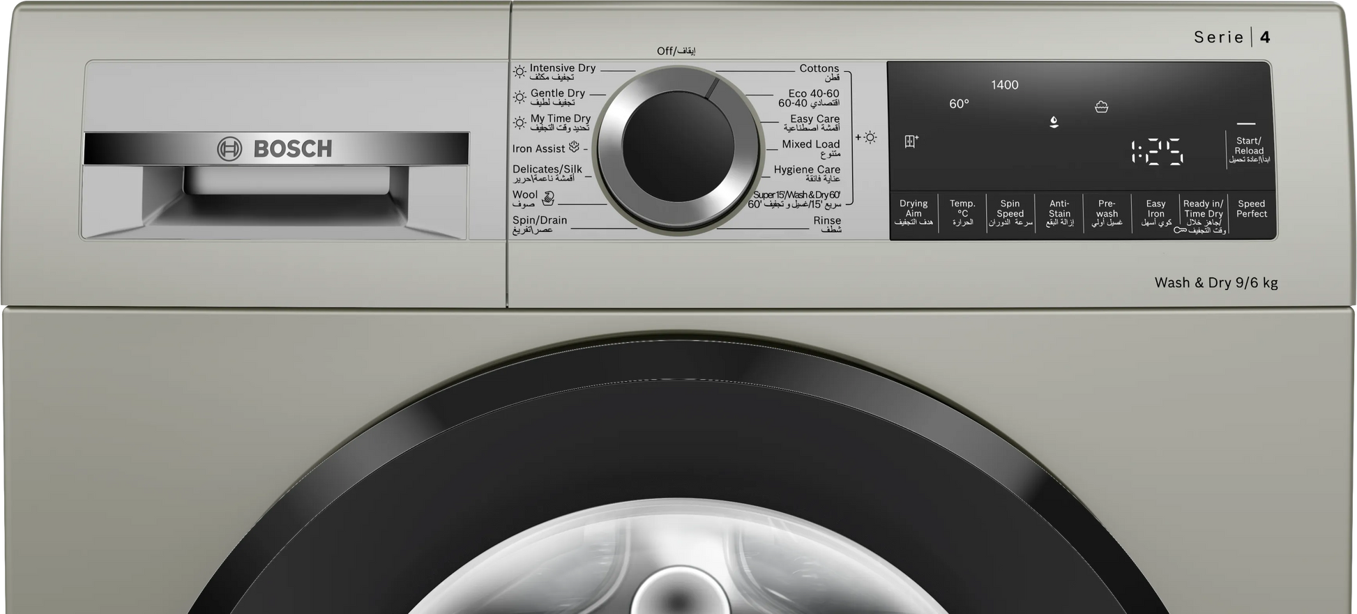 Bosch WNA244XSGC has 1400 RPM With a 9 kg wash capacity and 6 kg dry capacity, it’s “Wash & Dry 60 min” programme lets you wash and dry a small load in just one hour, while the SpeedPerfect option cleans up to 65% faster than standard cycles.