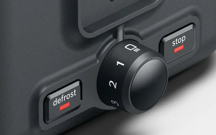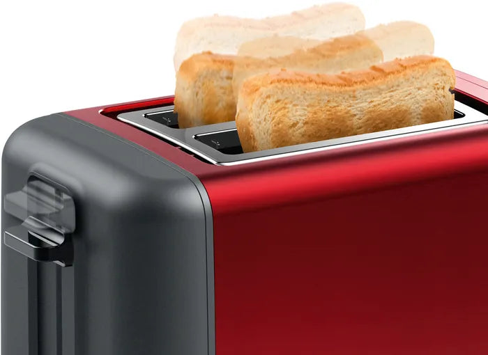 Bosch TAT3P424GB DesignLine Compact Toaster is an elegant kitchen accessory crafted for both style and convenience. Its vibrant deep red crystal finish, combined with a stainless-steel body, brings a splash of color and premium design to your countertop.