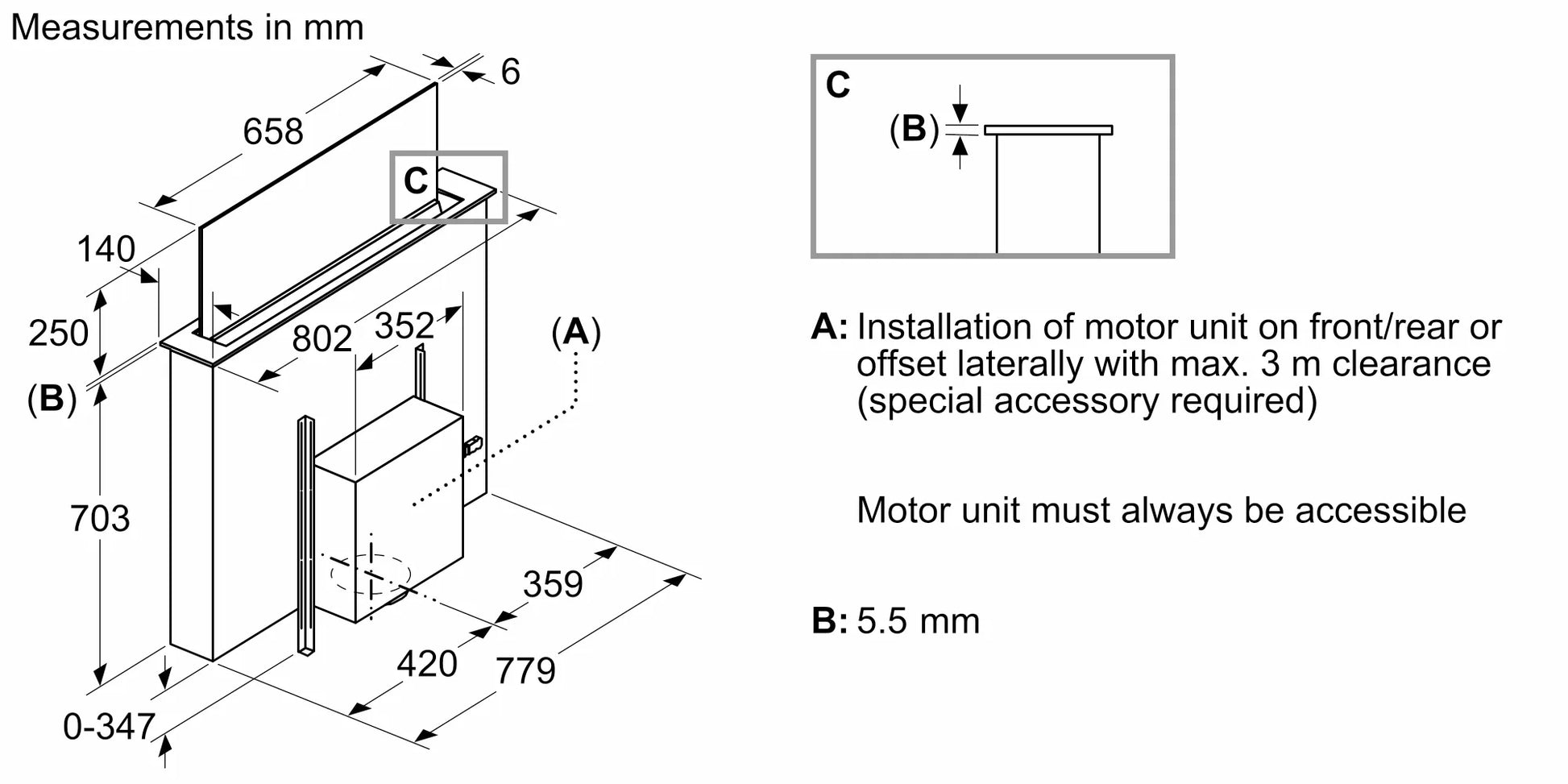 - Flexible installation: The motor can be placed up to three meters away from the extractor unit to maximize cupboard space beneath the hob. The unit is also convertible for either ducted (vented outside) or recirculation (filtered and returned to the room) operating modes.